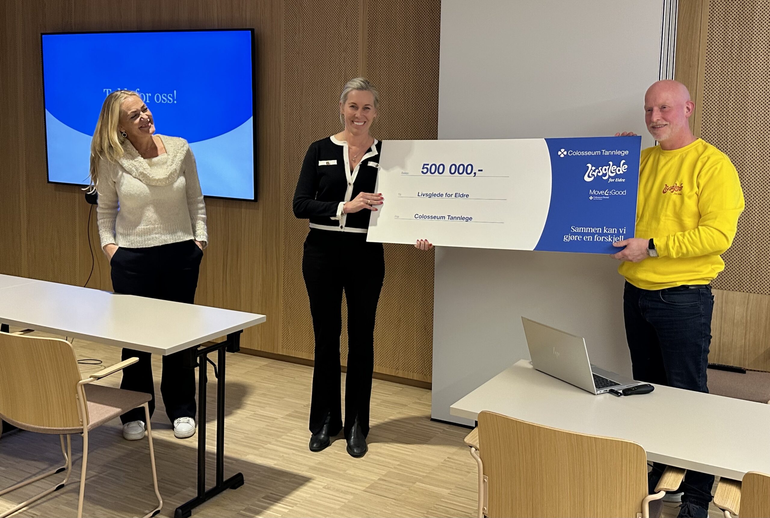 I dag fikk vi æren av å ta imot en gave som betyr enormt mye for oss, hele 500 000 kroner fra Colosseum Tannlege!